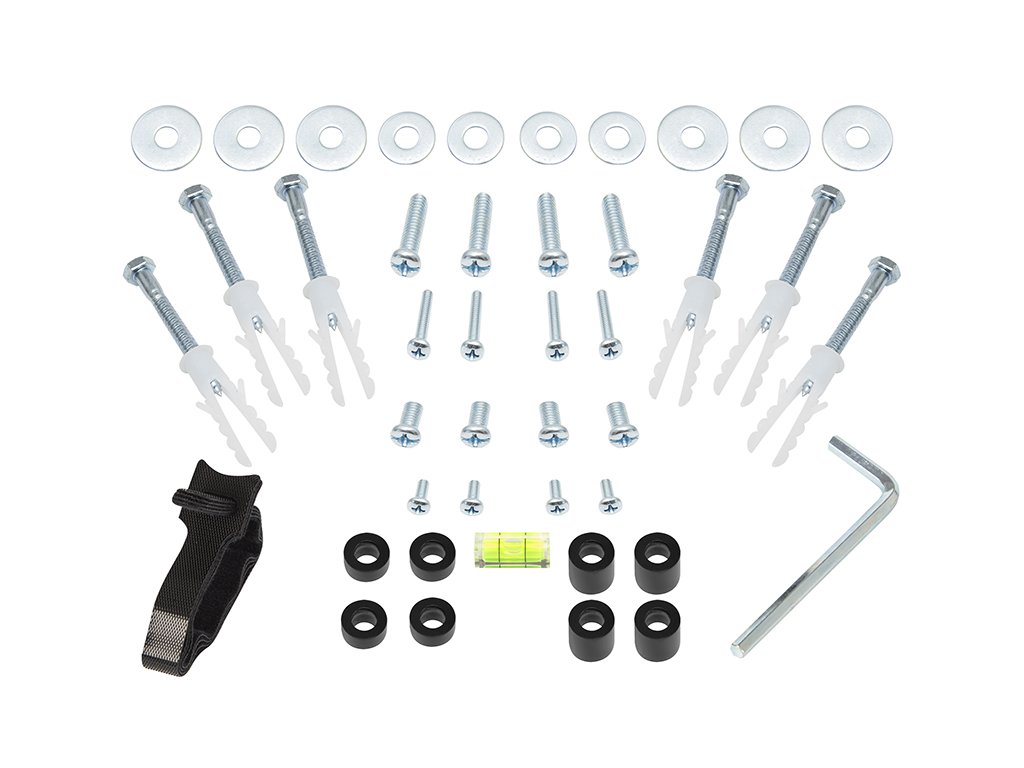 montážne príslušenstvo umožňuje namontovať nielen nástenný držiak, ale aj väčšinu televízorov bez nutnosti kupovať ďalšie skrutky alebo matice. Je však vhodné skontrolovať, či sú dodané hmoždinky vhodné pre stenu, na ktorú plánujete držiak namontovať.
