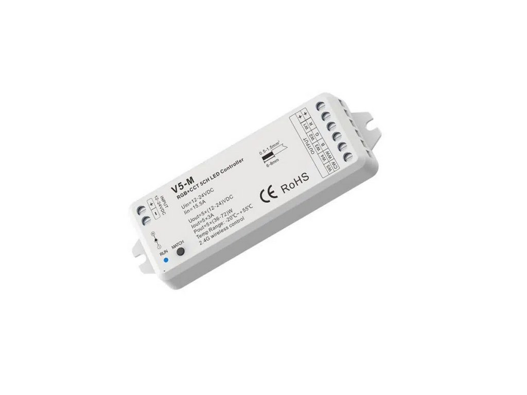 LED prijímač RGB+CCT, V5-M, 5x(12-24V), 5x3A