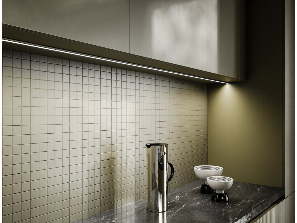 Konečný výsledok inštalácie profilu atómovej jednotky LED s tienidlom NANO pomocou montážnej konzoly atómu.