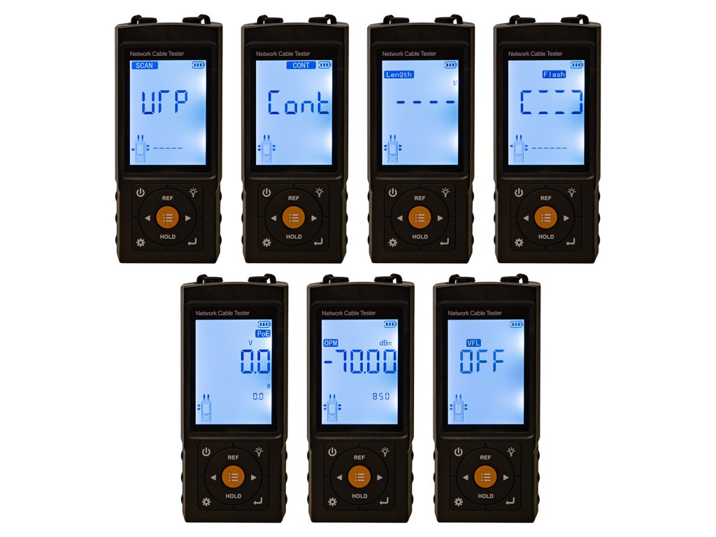Umožňuje vám skontrolovať kontinuitu a poradie párov v kábloch RJ45 a RJ11, lokalizovať prerušenia a poruchy na začiatku, v strede a na konci kábla. Vstavaná funkcia merania dĺžky kábla až do 600 m a umiestnenie portov v ethernetových prepínačoch (100/1000 Mbps) výrazne zjednodušujú prácu inštalatérov. Zariadenie podporuje detekciu napájania PoE (IEEE 802.3af/at/bt), má prehľadný 3-palcový LCD displej a je napájané z batérie, čo zaisťuje prenosnosť a pohodlie v teréne.